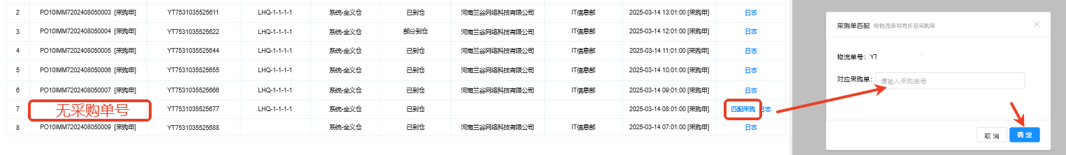 ①包裹无对应采购单:可联系客户认领该无主货,点击【匹配采购】功能,填写可用采购单号。