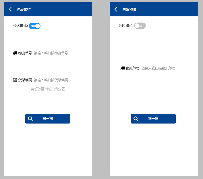 ①打开鸿展PDA,点击包裹预收,点击物流单号一栏扫描包裹即可;分区模式开关,开启状态下为分区模式,关闭状态下为常规模式,若业务需要记录包裹暂存区域则开启分区模式,该分区将体现于理货管理页面,该模式下需填写货架编码。若仅记录包裹到仓,则无需使用分区模式。