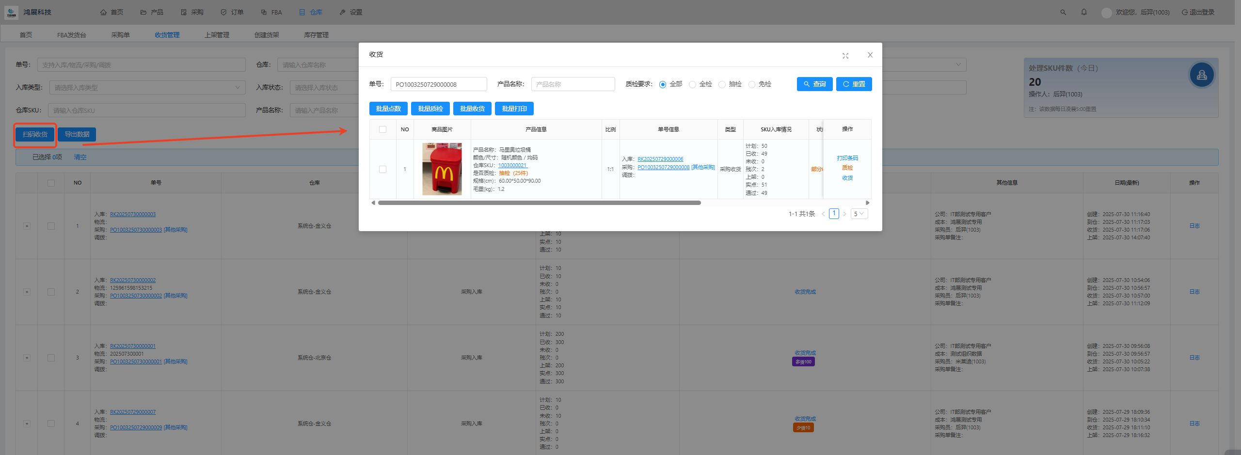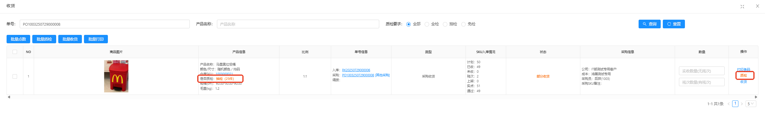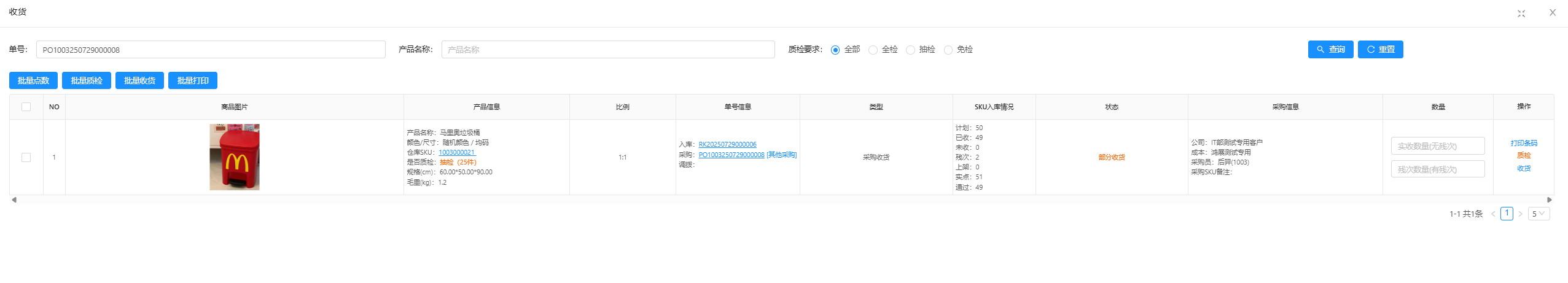 四、页面功能概述:用于系统仓库完成收货或标记质检点数,查看收货详情以及批次数据,以及查看收货单对应采购单数据。