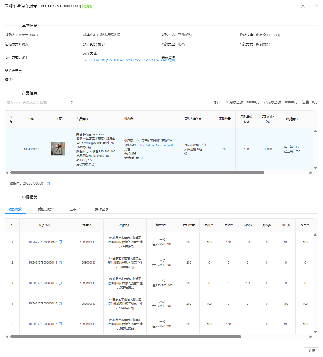 4.查看采购单信息:点击采购单号可查看采购单详情,可查看采购单采购情况与质检点数上架情况。