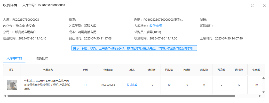 3.查看收货详情:点击入库单号可查看收货详情,可查看SKU收货信息与批次收货记录