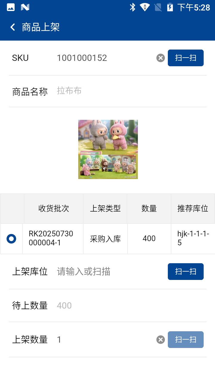 2.上架操作:进入PDA-选定PDA上架仓库(选择一次即可),进入商品上架功能,扫描待上架SKU,展示该SKU与之对应的待上架上架单,选择对应上架单,选择上架库位,填写上架数量,即可完成上架操作,一个上架单可进行多次上架,上架完成后,上架单将不可继续上架。