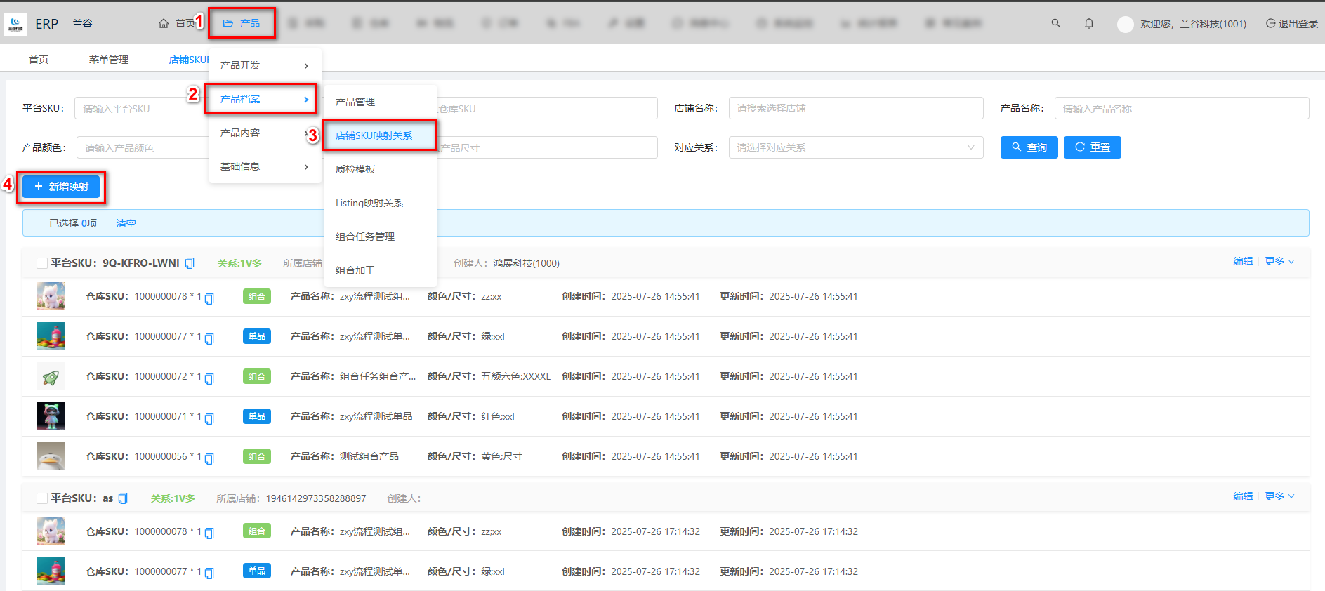 如下图,按1-2-3步骤进入店铺SKU映射关系界面,支持按照平台SKU、店铺名称、产品信息等查询映射关系。
