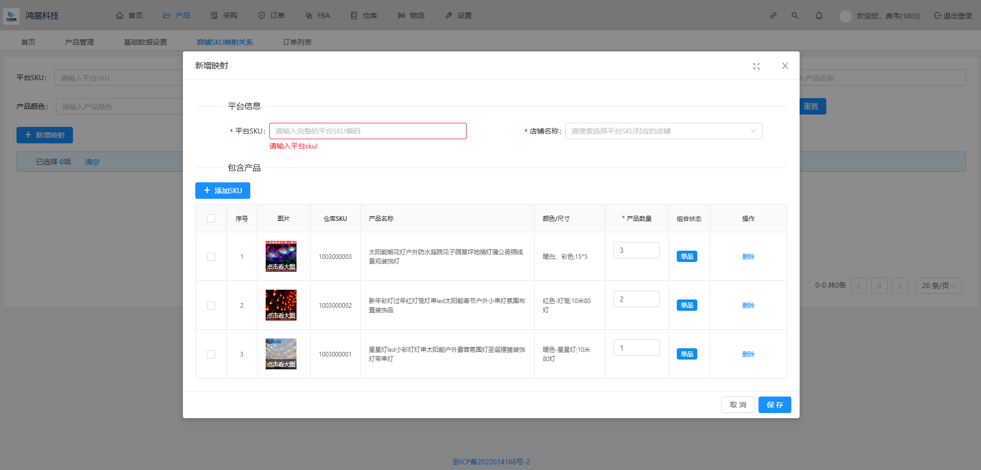 包含产品:选择平台售卖的SKU在仓库中对应的SKU编码及数量,至少添加一个仓库SKU数量后可建立映射关系。
