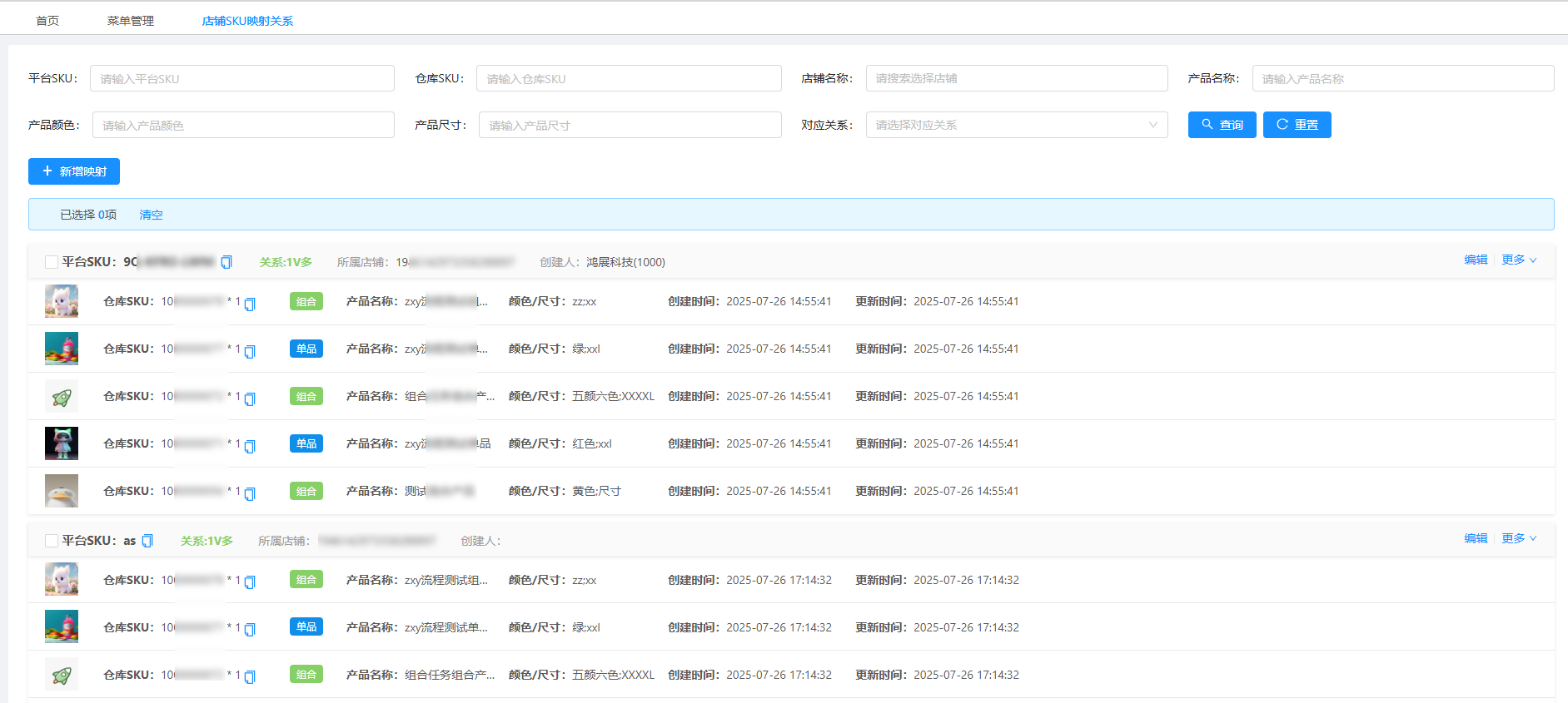 支持查看自己所管理店铺下的SKU映射关系;页面映射关系以上下级展示形式展示,上级表示【平台SKU+店铺名称】信息,下级表示仓库SKU信息。