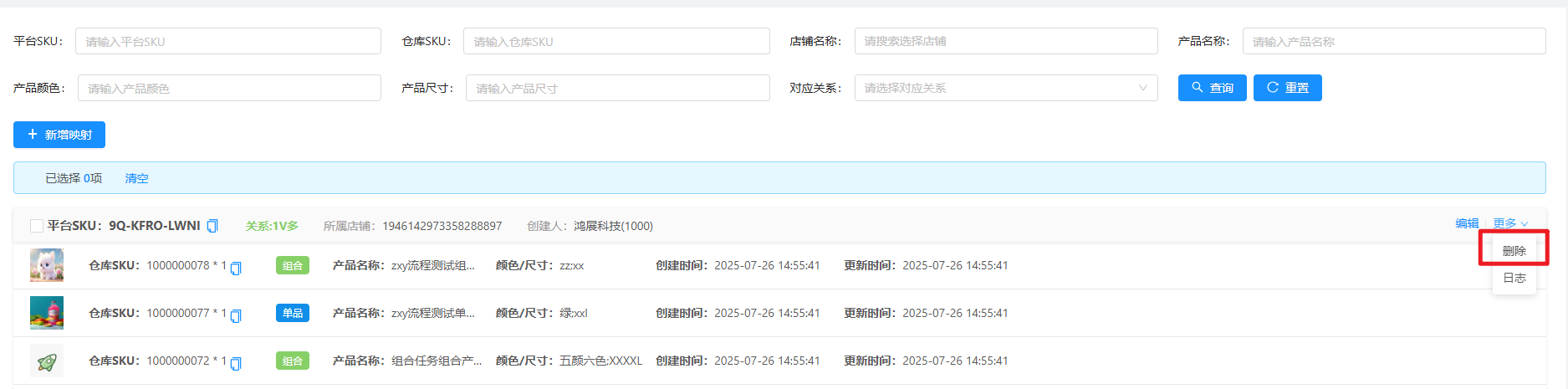 维护SKU映射关系以【平台SKU+店铺】维度唯一,重复添加【平台SKU+店铺】时,最后添加的关系会覆盖上一次相同【平台SKU+店铺】添加的映射关系,此处添加的映射关系用于店铺同步平台订单时关联到订单上。