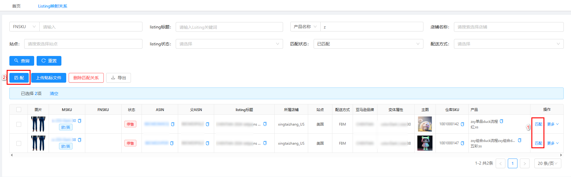 可对单个listing数据设置SKU匹配关系,见下图中步骤1。