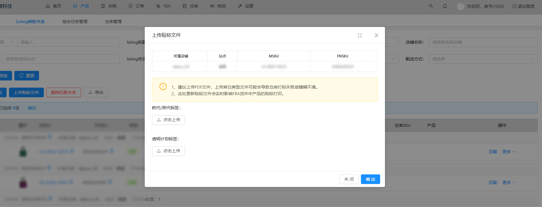 此处支持按照Listing维度设置对应的贴标文件,可上传欧代/英代标签、透明计划标,此处上传的文件用于后期FBA货件发货时给商品贴欧代/英代标签、透明计划标签。