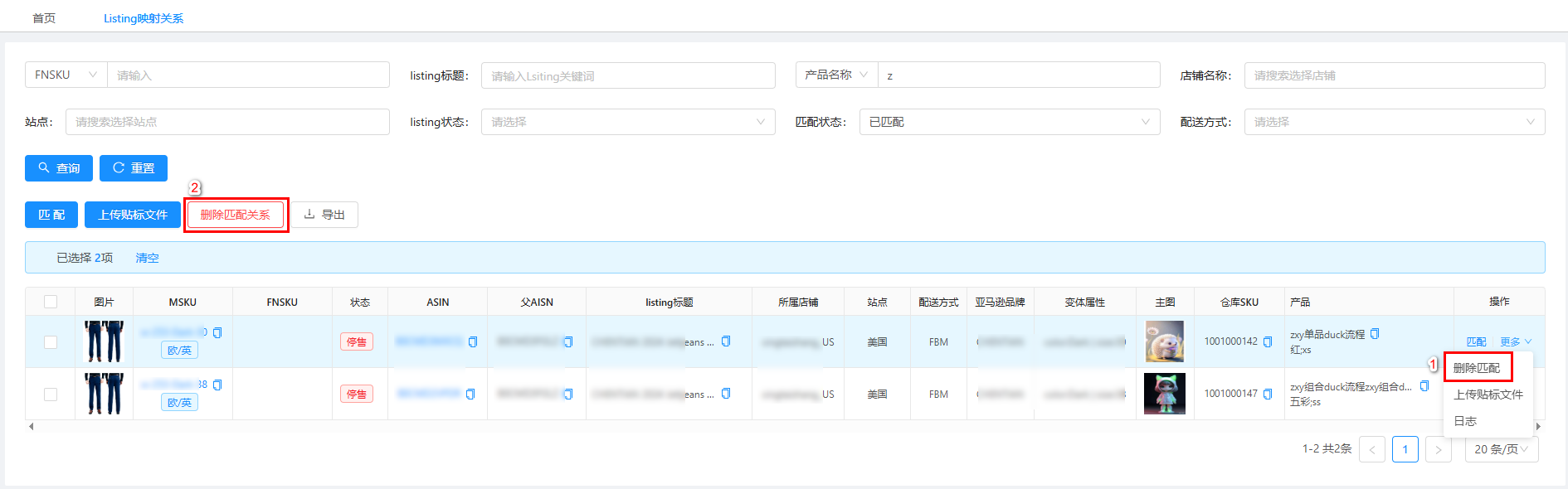 支持对单一Listing解除匹配关系,如下图中步骤1。