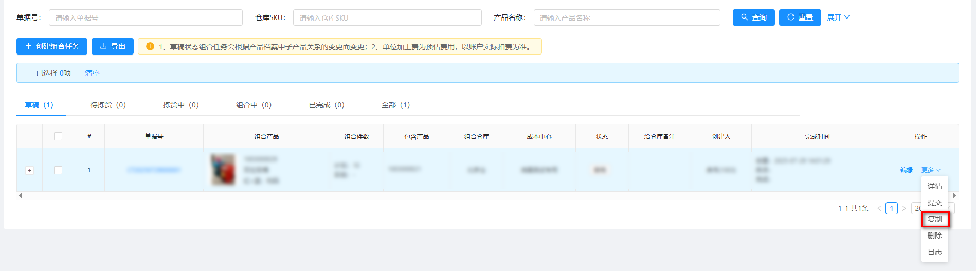 点击【复制】按钮,将所选的组合任务信息复制作为一个新的组合任务单据提交,如下图所示: