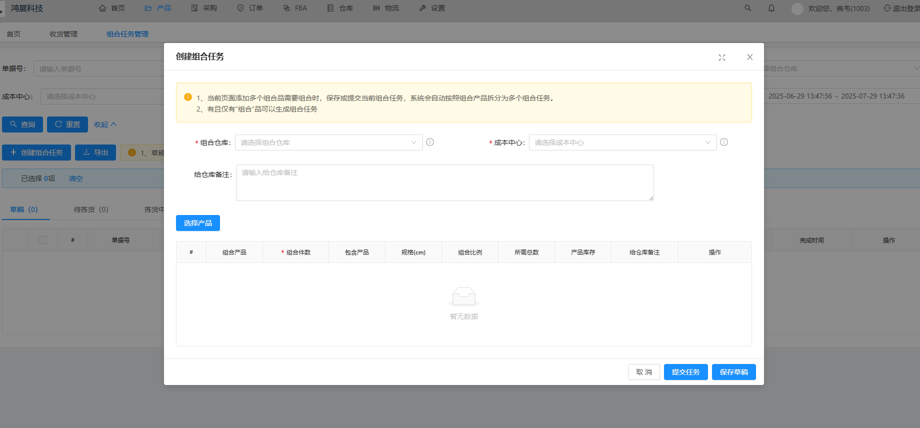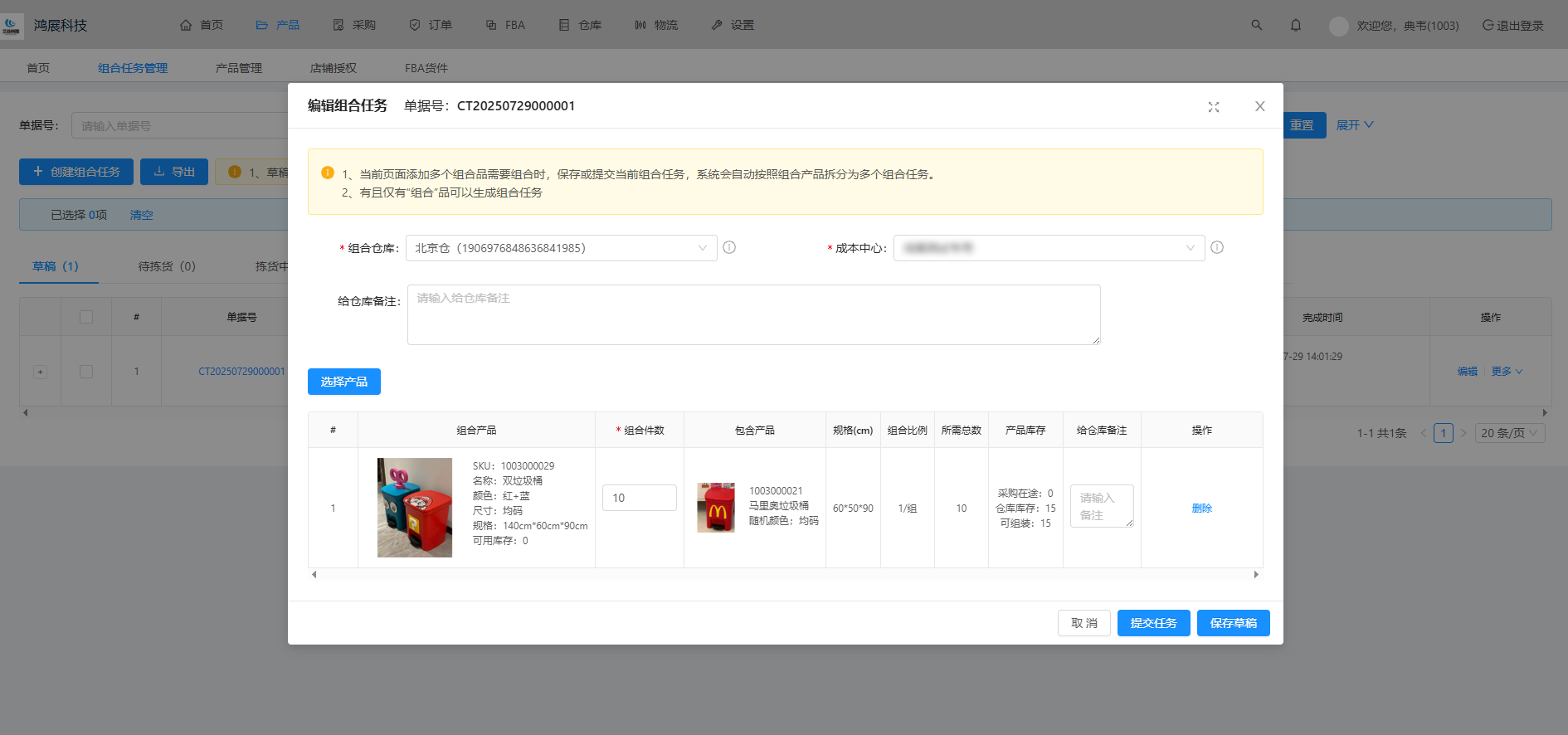 功能说明:对采购入仓的商品创建组合加工任务,并将任务提交给仓库处理、加工等全过程管理。