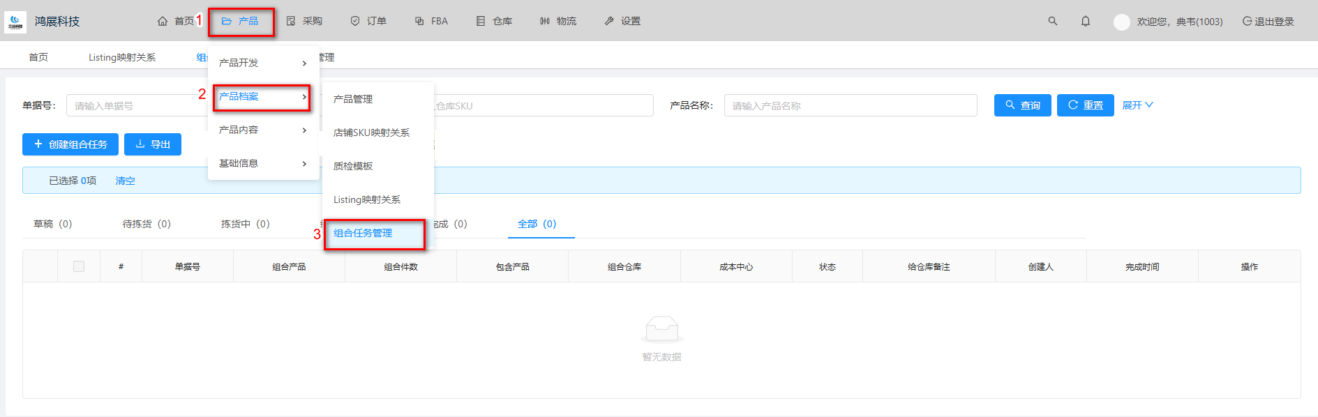 如下图,按1-2-3步骤进入组合任务管理页面,有此页面权限的人可查看登录账号配置成本中心下的组合任务数据,页面加载以单据状态分类显示,以下为单据状态说明: