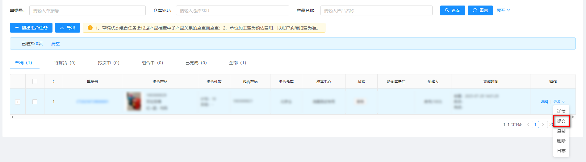 点击【提交】按钮,将未提交给仓库的组合任务直接提交给仓库进行组合,如下图所示: