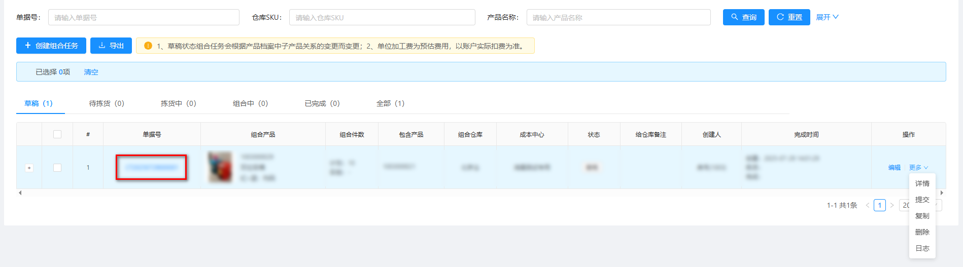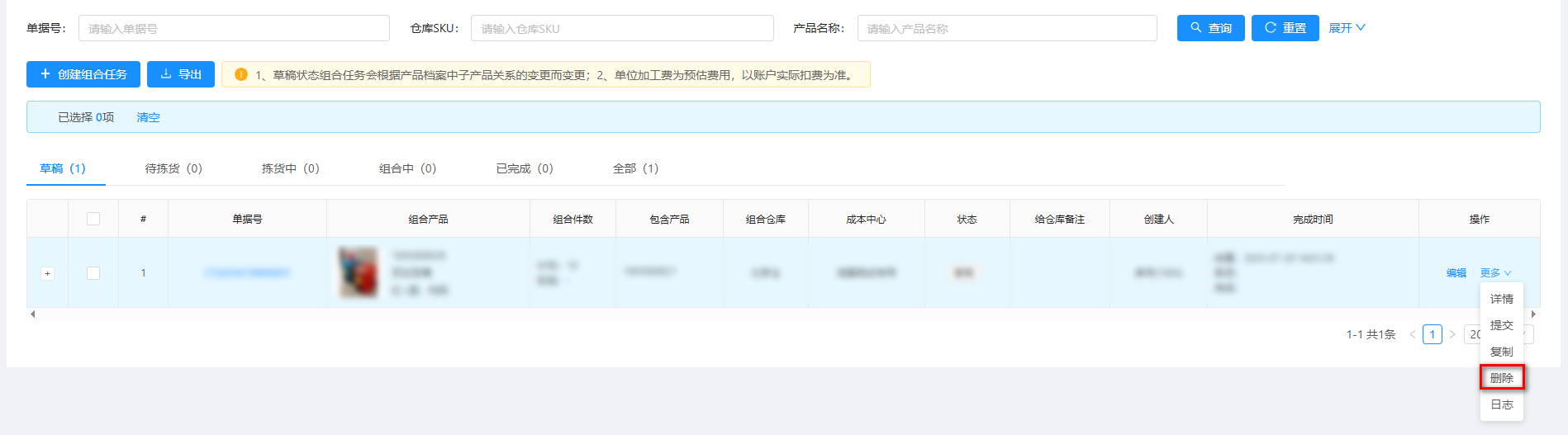 - 待拣货:组合单据已提交给仓库且仓库未开始拣货,此时支持删除发给仓库的组合任务。