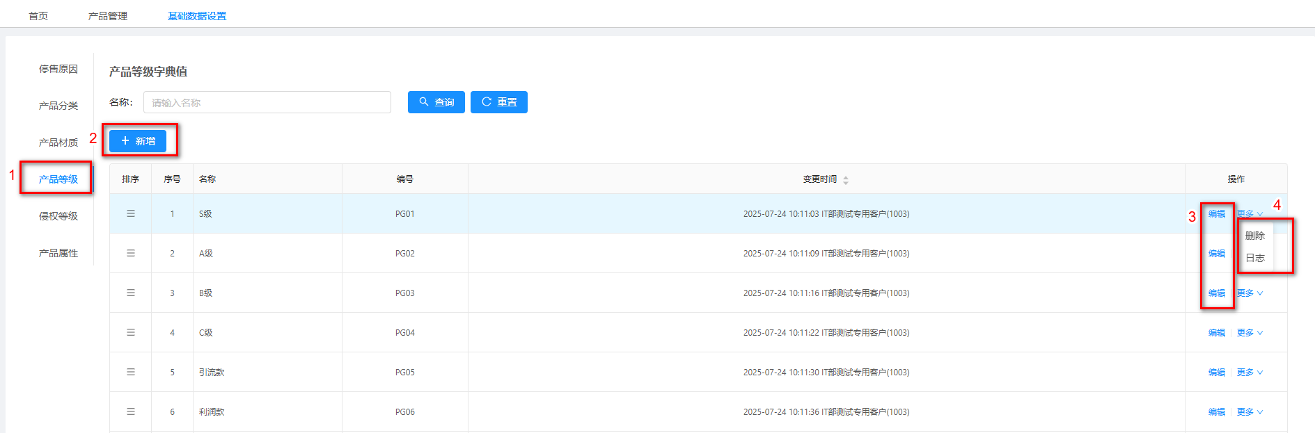 - 点击【编辑】、【删除】可对当前产品等级的字段值进行修改、删除,被产品管理使用后的字段值不支持修改、删除。
