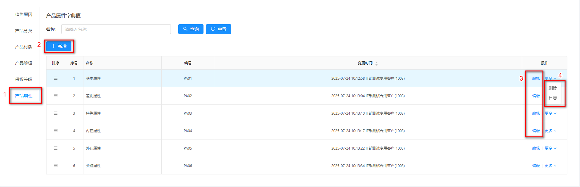 维护本公司划分的【产品属性】字段值,可新增、编辑、删除字段值;可查看修改记录。