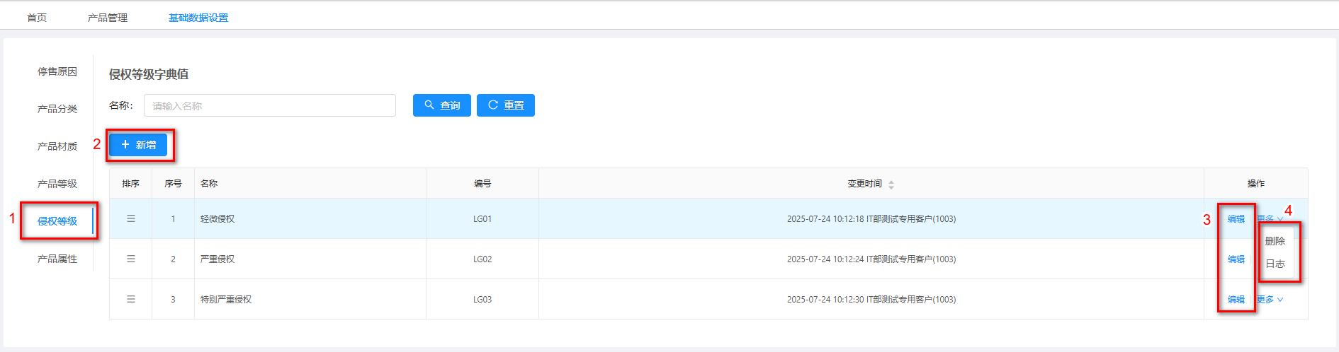 - 点击【编辑】、【删除】可对当前侵权等级的字段值进行修改、删除,被产品管理使用后的字段值不支持修改、删除。
