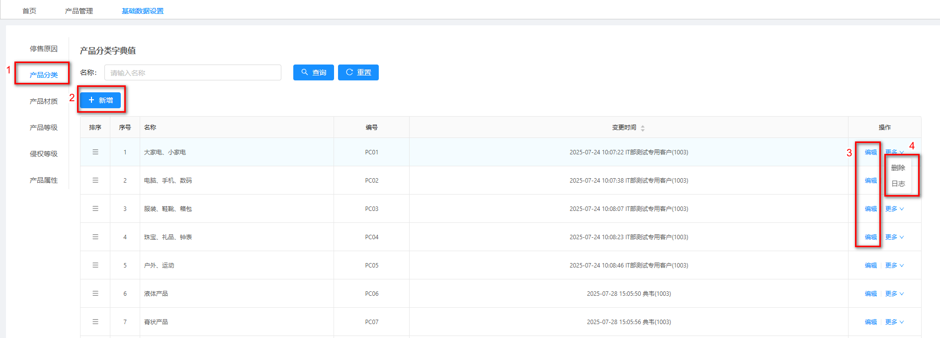 - 点击【编辑】、【删除】可对当前产品分类的字段值进行修改、删除,被【产品管理】模块使用后的字段值不支持修改、删除。