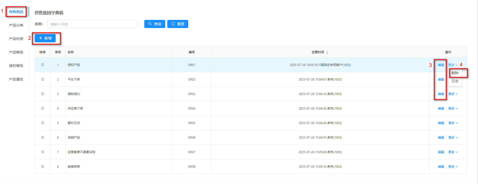 - 点击【编辑】、【删除】可对当前停售原因的字段值进行修改、删除,被产品管理使用后的字段值不支持修改、删除。