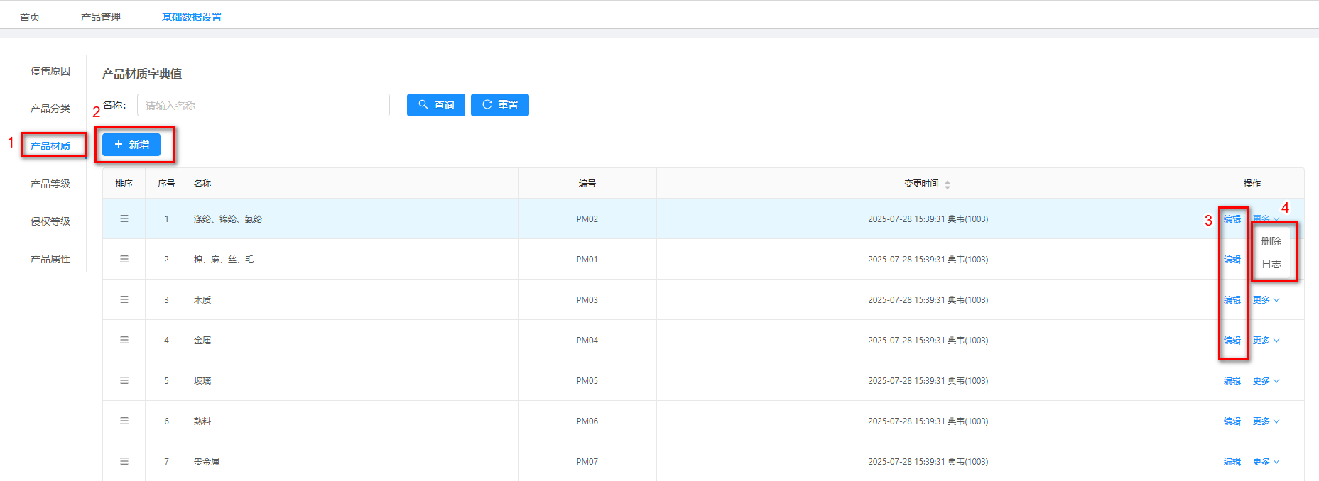 - 点击【编辑】、【删除】可对当前产品材质的字段值进行修改、删除,被产品管理使用后的字段值不支持修改、删除。