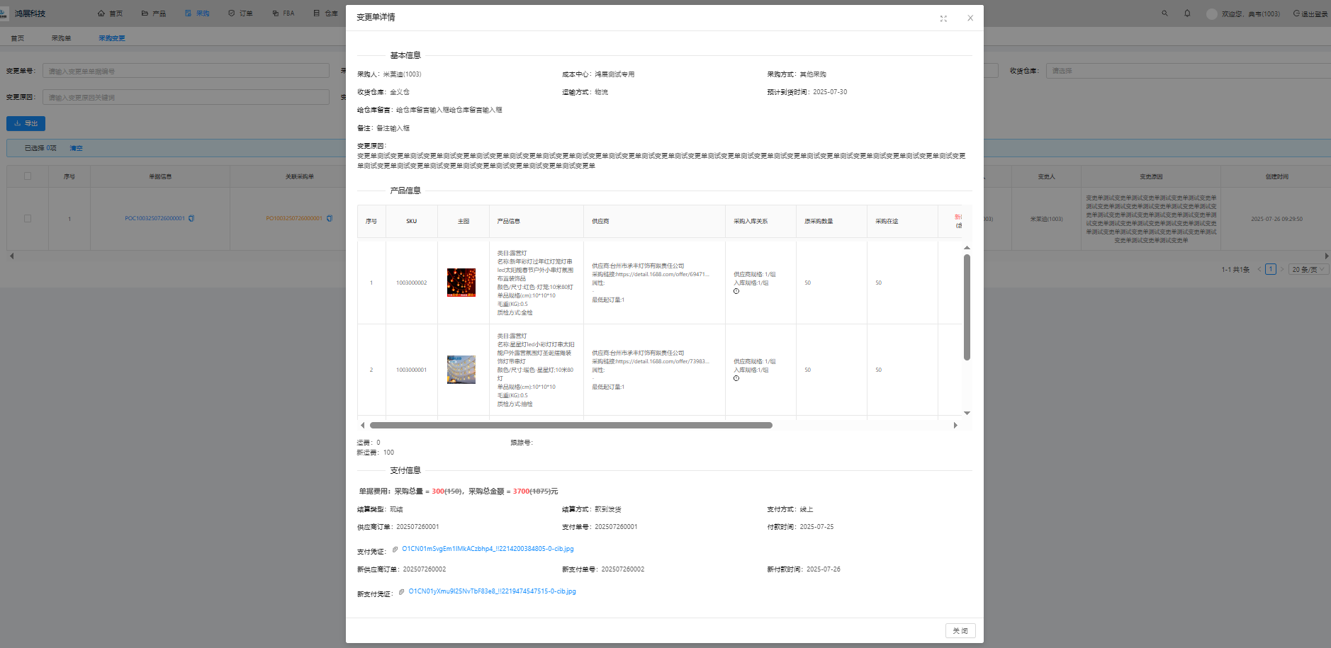功能说明:用于记录采购单的变更记录,可对比查看变更前和变更后的数据信息。