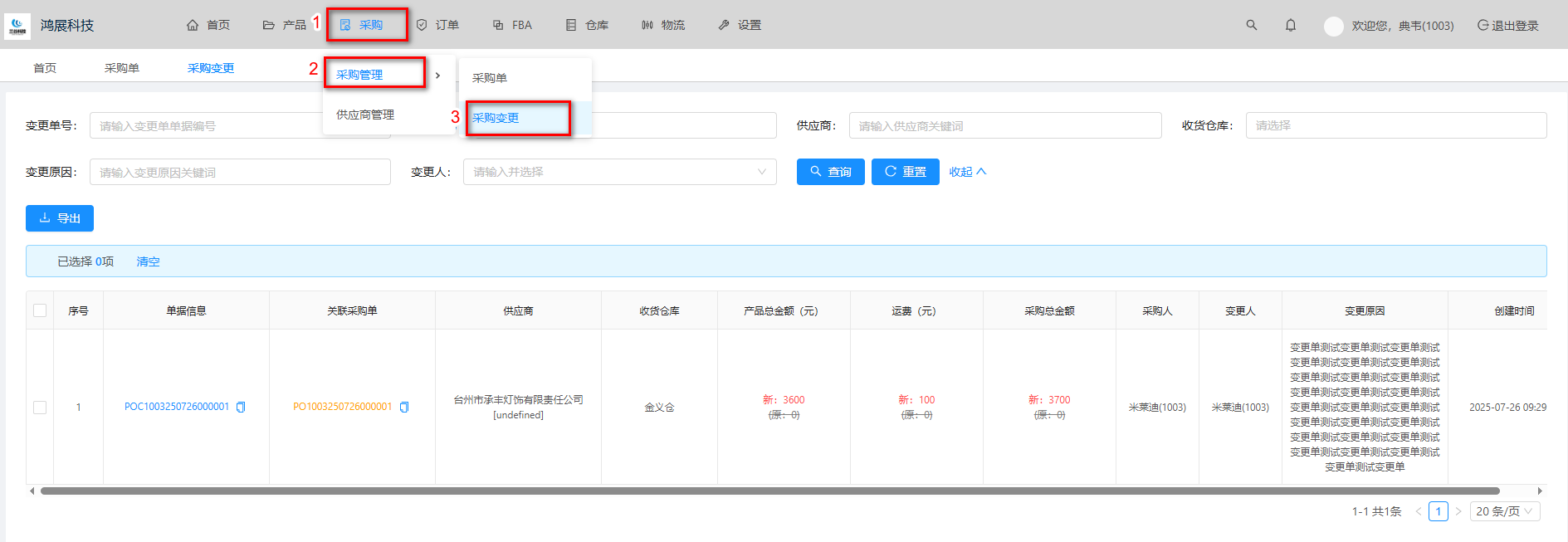 支持按照变更单号、采购单号、供应商等信息查询数据;