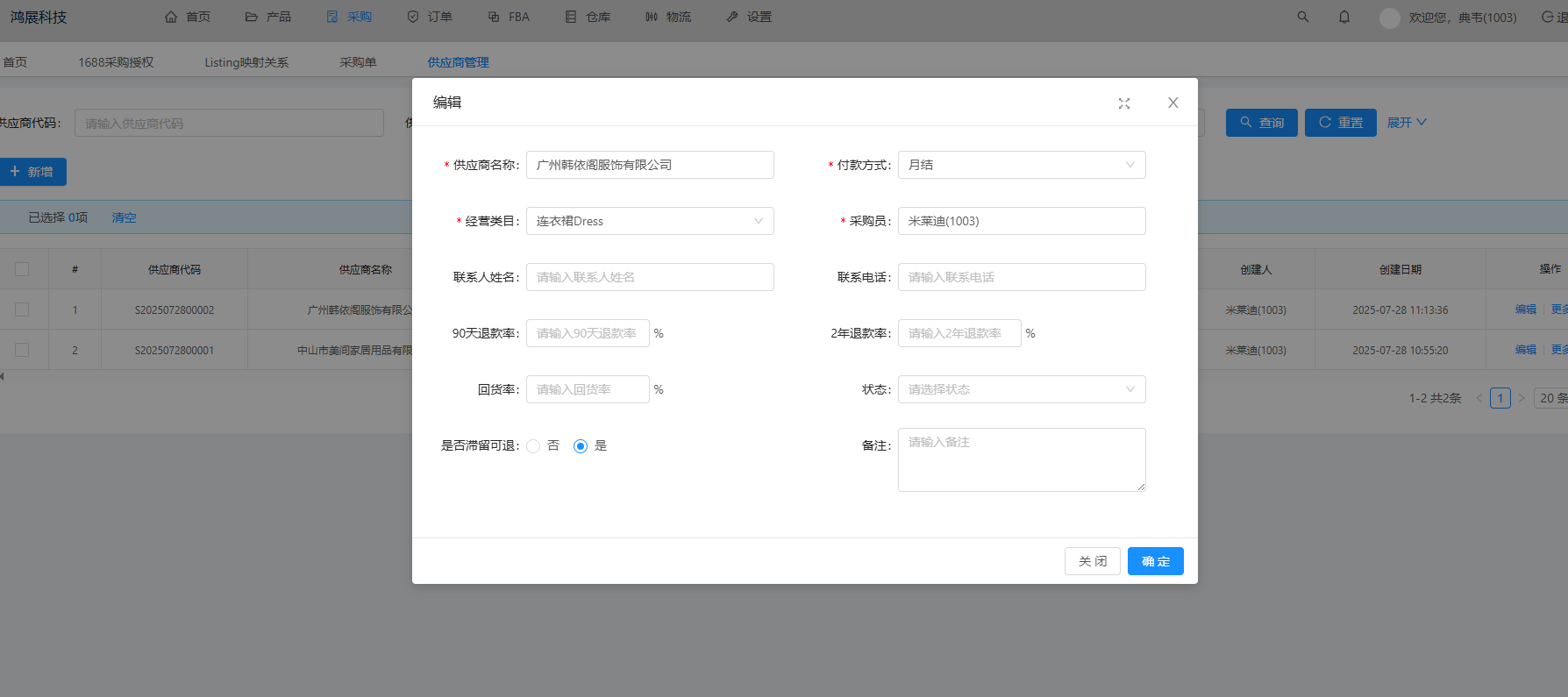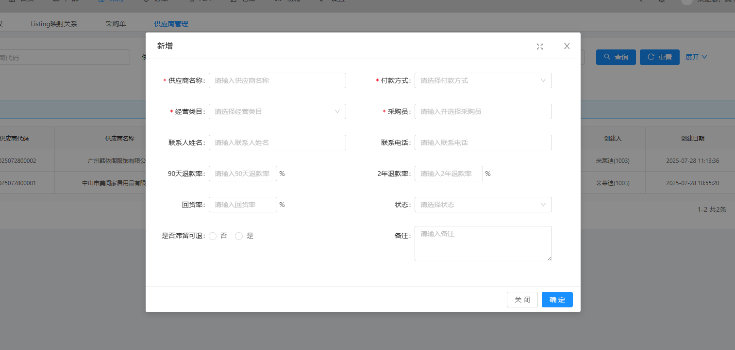 1、点击【新增】按钮增加供应商;2、【产品管理】页面添加采购数据时添加供应商信息。如下图供应商需要维护的信息。