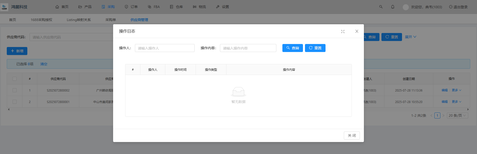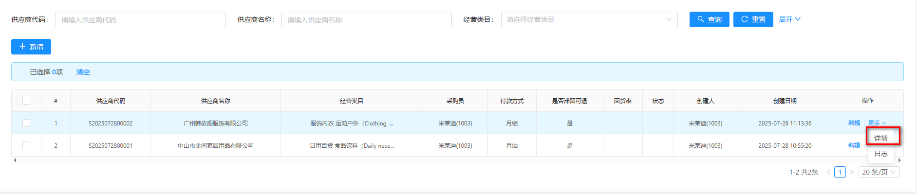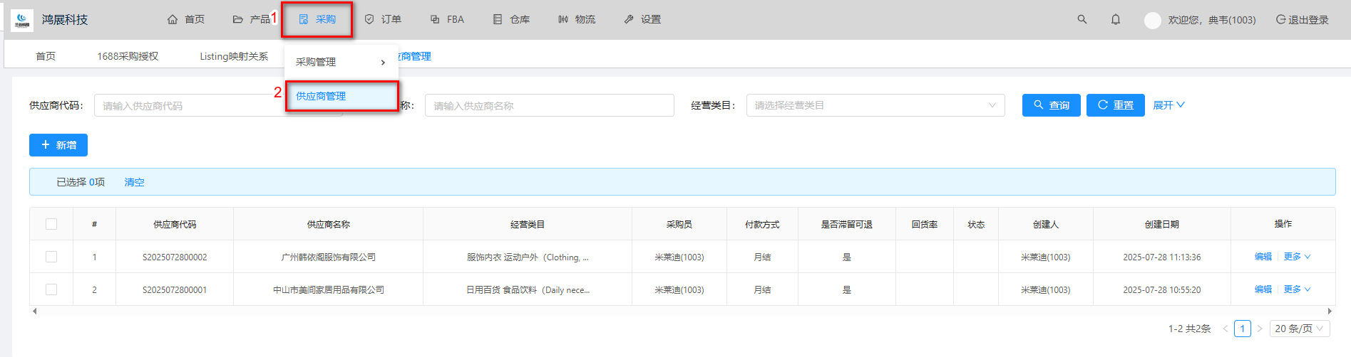 点击下图中步骤1-2进入供应商页面,默认显示本公司下所有的供应商信息,如下图所示: