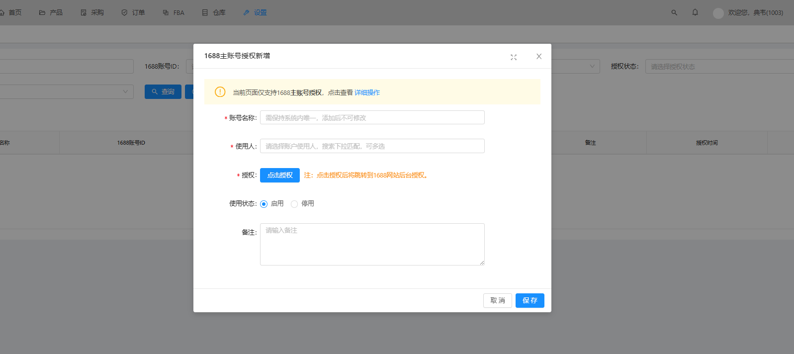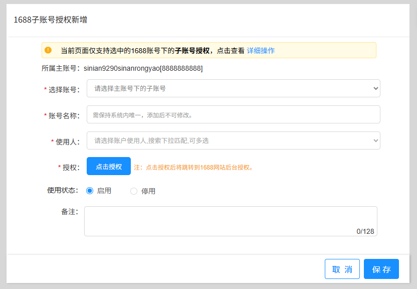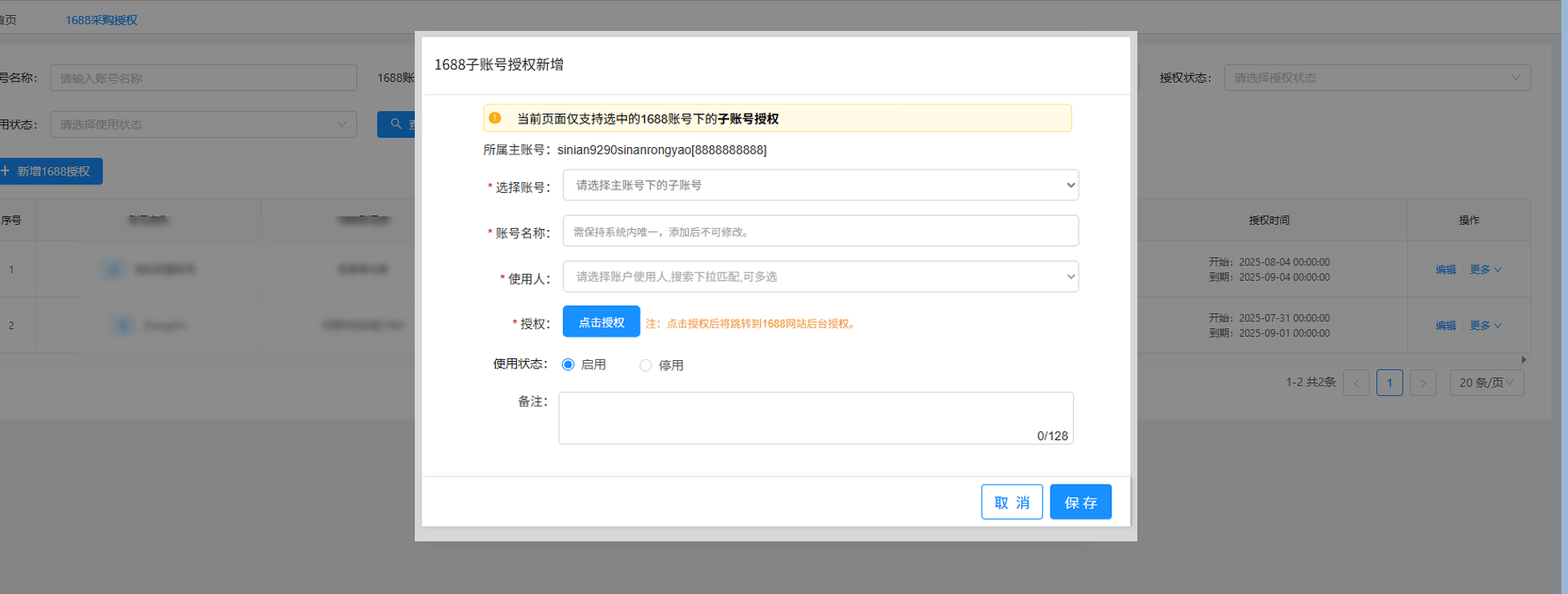 点击【新增1688授权】按钮,添加1688授权账号信息(注:此处仅支持添加1688主账号)。