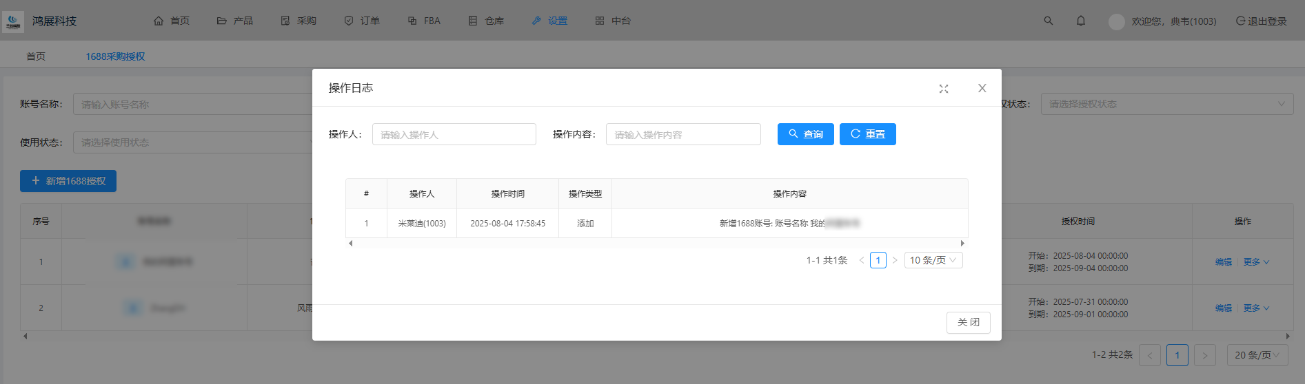 功能说明:用于统一管理1688账号数据,将1688账号成功授权给ERP系统后,将用于采购、产品供应商属性获取等业务。
