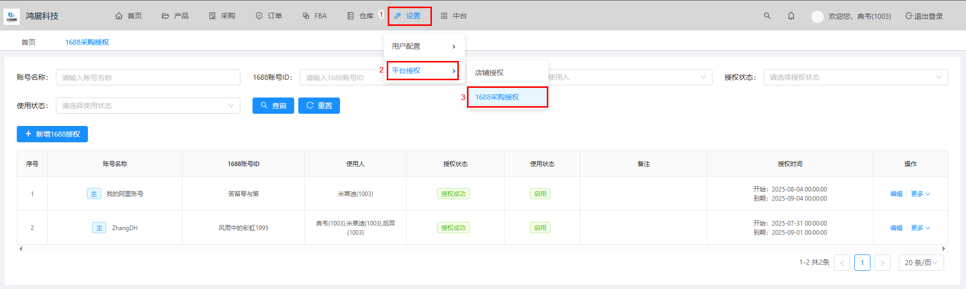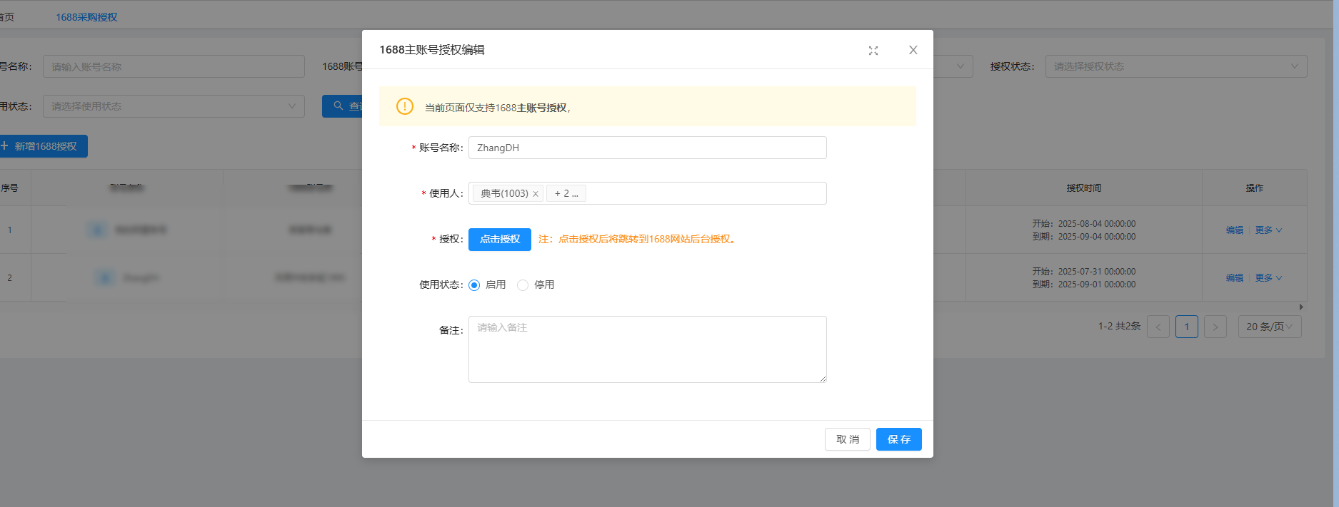 支持按照账号名称、使用人、授权状态、使用状态等查询1688账号数据。