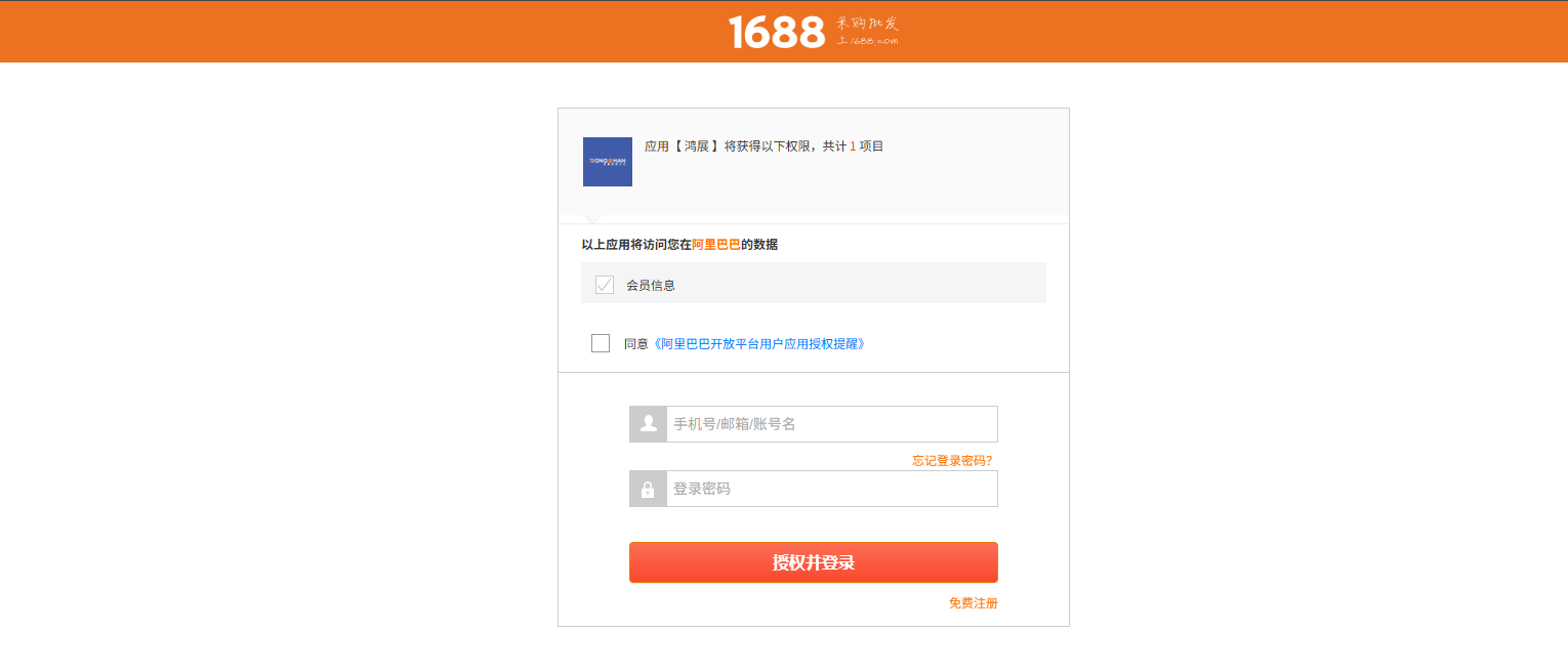 完成页面信息后,点击【点击授权】按钮,跳转到1688平台授权账号,如下图所示: